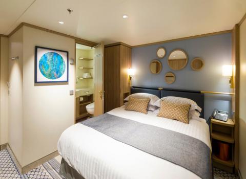 To complete the options of accommodation and offer great choice and value, Iona’s cabin selection of course includes Sea view (Outside) and Inside cabins. Here, too, the design and choices of colours and materials optimises the seaside feel. Porthole mirrors, blue feature walls and soft furnishings and accessories in gold and white textiles bring a sense of light and relaxation to the interior space. The clever design of these cabin types maximises storage options and all cabins boast the personal touches that create a stylish and comfortable atmosphere – including tea and coffee-making facilities (with tasty biscuits provided daily), a well-stocked fridge, in-cabin TV with a host of channels to choose from, and a bathroom boasting soft cotton towels and quality toiletries courtesy of The White Company.