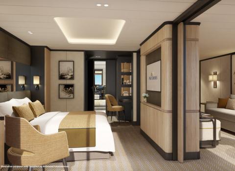 Aft and Forward Suites are always special, giving guests the ultimate experience of relaxation in their own boutique-hotel haven. The Suites on Iona take this to another level of comfort and style. The design direction is one of contemporary comfort and elegance – a luxurious space is created as the doors of interconnecting rooms open fully to create a larger, brighter studio ambience. The furniture and material selection is focused on guest relaxation and comfort, and light tones add to the feeling of spaciousness. Furniture, including sofas, ottomans and lounge chairs, is upholstered in sands, beiges and off-whites. This core colour palette is complemented by soft furnishings and accessories such as cushions and luxurious twill throws in mustard hues with navy detailing. Lighting, fixtures and fittings, and bathroom finishes and materials match this extraordinary quality of detail. In the spacious bathroom, the double sink units set in stunning black marble are a striking focal point, surrounded by elegant white marble walls and floor tiling. As with all Suites, guests benefit from the clever configuration of different interior zones with separate lounge and bedroom areas, segregated dressing areas and spacious en suite bathrooms. All Suites have direct access to large balconies and benefit from a range of exclusive services, such as a personal Butler and a range of in-suite dining options.